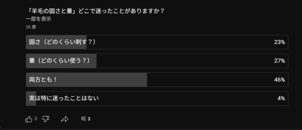 YouTubeコミュニティで「羊毛の固さと量」についてアンケートを行ったところ、26名の方にご参加いただきました。(2025年9月28日15時現在)