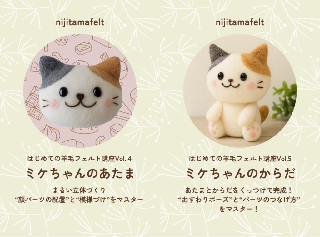 フェルトボールで「かため方」のコツがつかめたら、次は ミケちゃんのキット がとても作りやすくなります。丸 → 楕円・たまご型 へ進むと、作品づくりの幅が一気に広がります。