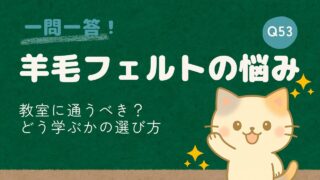 羊毛フェルトQ&A 羊毛フェルトの教室に通うべき?自分に合った学び方のポイント 【一問一答Q53】羊毛フェルトの教室に通うべきか迷ったときの考え方を解説。独学と教室、それぞれの向き不向きと自分に合った学び方を紹介します。 2026.02.23 羊毛フェルトQ&A講座
